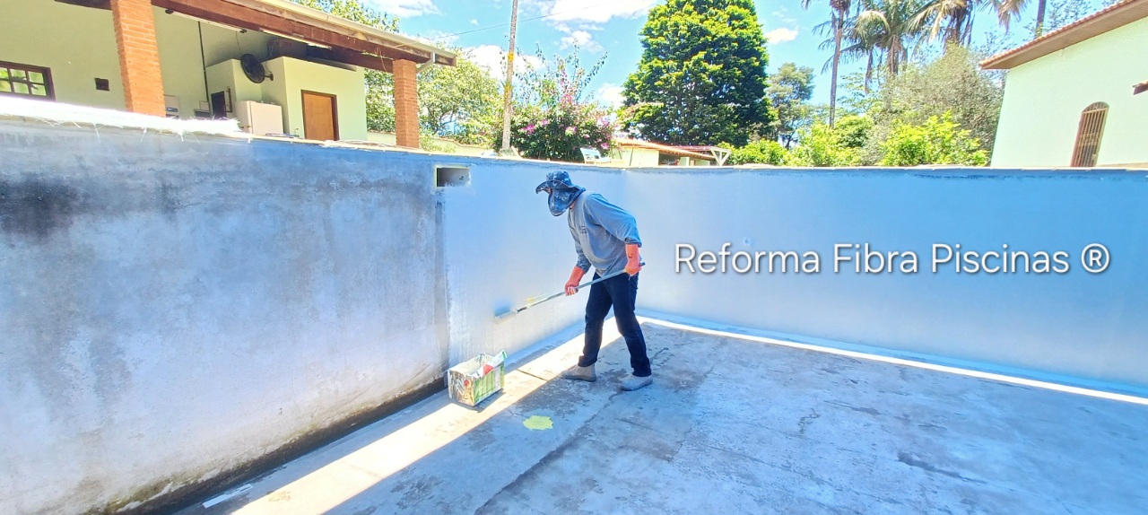 Reforma de piscina de fibra - Remoção do bolsão de vinil e revestimento em fibra - Revitalização de pintura com Gel Isoftálico - Construção de piscinas de alvenaria com revestimento em fibra